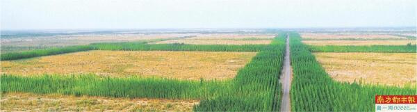 站在生态林观景平台上,极目远眺,一边是黄沙莽莽,一边是绿意葱葱。麦盖提县副县长王小虎指着这片绵延的绿色,向远道而来的客人们揭开了这场“绿进沙退”的“战争”序幕。